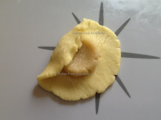 طريقة التشكيل التقليدية تقنية للغاية ، تتطلب إتقانًا محكما وتعتمد بشكل أساسي على مرونة العجين الذي يوفره الغلوتين. نظرًا لأننا نستعمل هنا عجينة خالية من الغلوتين ، فقد خطرت لي فكرة تشكيلها باستخدام هذه التقنية البديلة الموضحة في الصور للتحايل على عدم مرونة العجين.